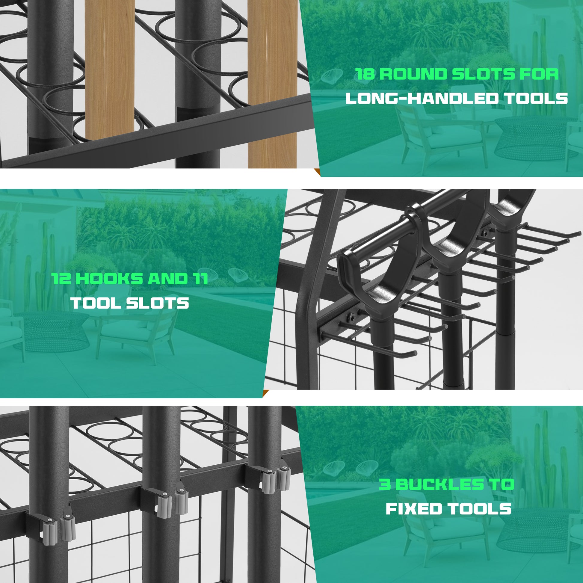 All-in-One Design: Revolutionize your gardening experience with this upgraded tool rack that combines shelves, tool slots, racks, baskets, hooks, and buckles.